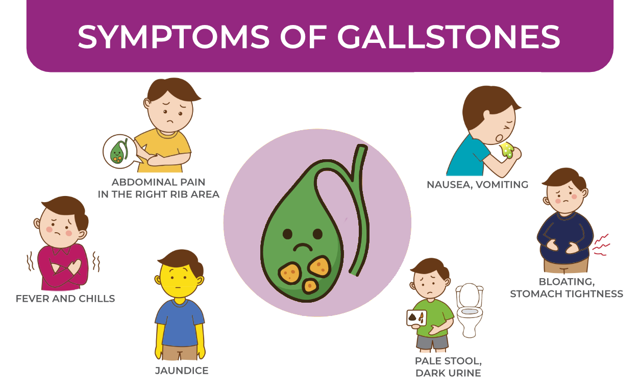 Gallstones often cause no symptoms at all, but when they do, they typically cause sudden, severe pain in the upper right part of the abdomen or just below the breastbone. This pain can last for several hours and may radiate to the back or right shoulder. Other symptoms include nausea, vomiting and digestive discomfort, especially after eating fatty meals.